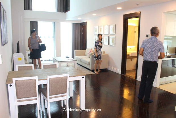 Hoang Thanh Building is a luxury serviced apartment tower located in Hai Ba Trung district, central Hanoi, offer modern duplex apartment for rent, 132 m2, 2 bedrooms, 2 bathrooms, nice living room with high ceiling, separate kitchen includes high end equipment, well design, cozy space, professional services that make your comfort living. Amenities available: Four seasion swimming pool, luxury gym, 24 hour reception and guard.